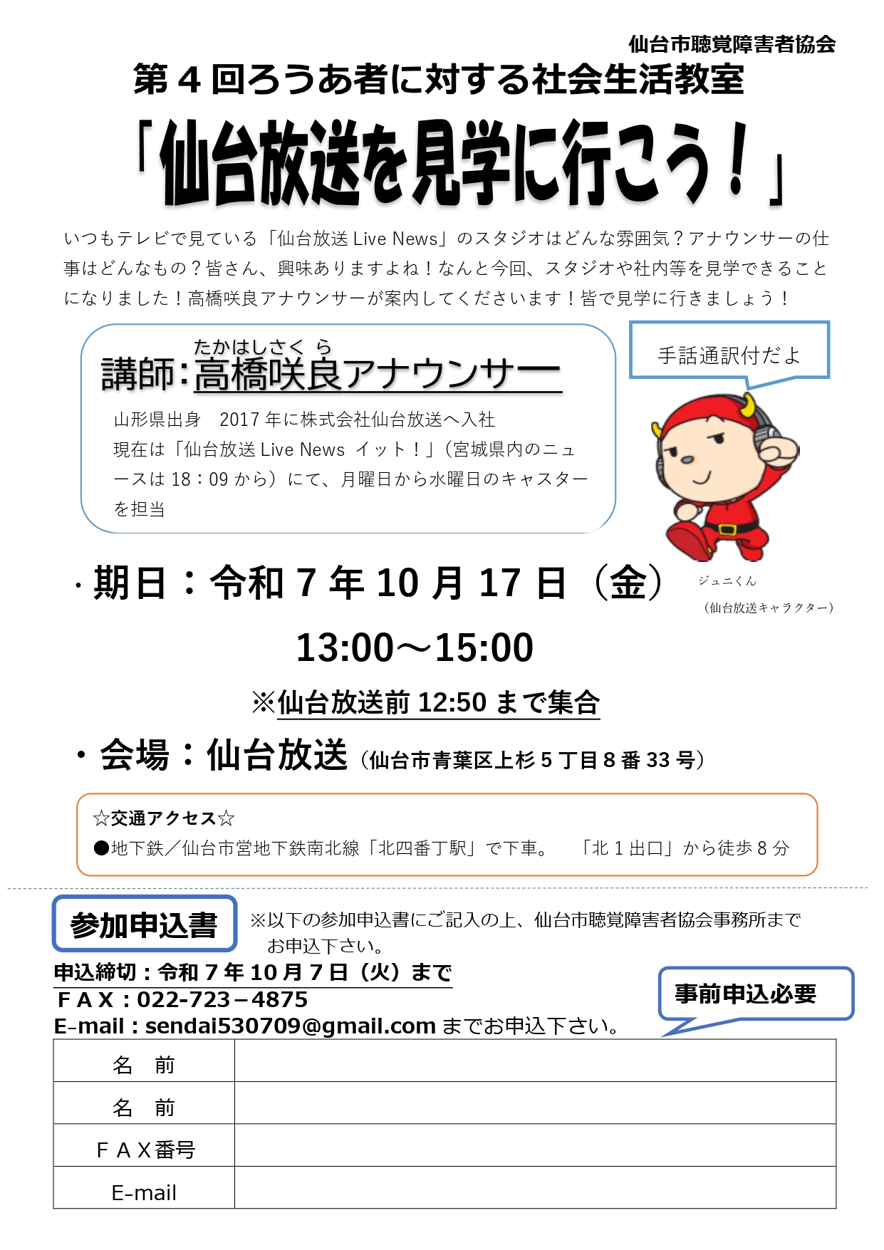 - 11/8「~シニア(高齢者)向け~加齢と味覚について」〆切11/4【仙台市聴覚障害者協会】 2025年10月6日